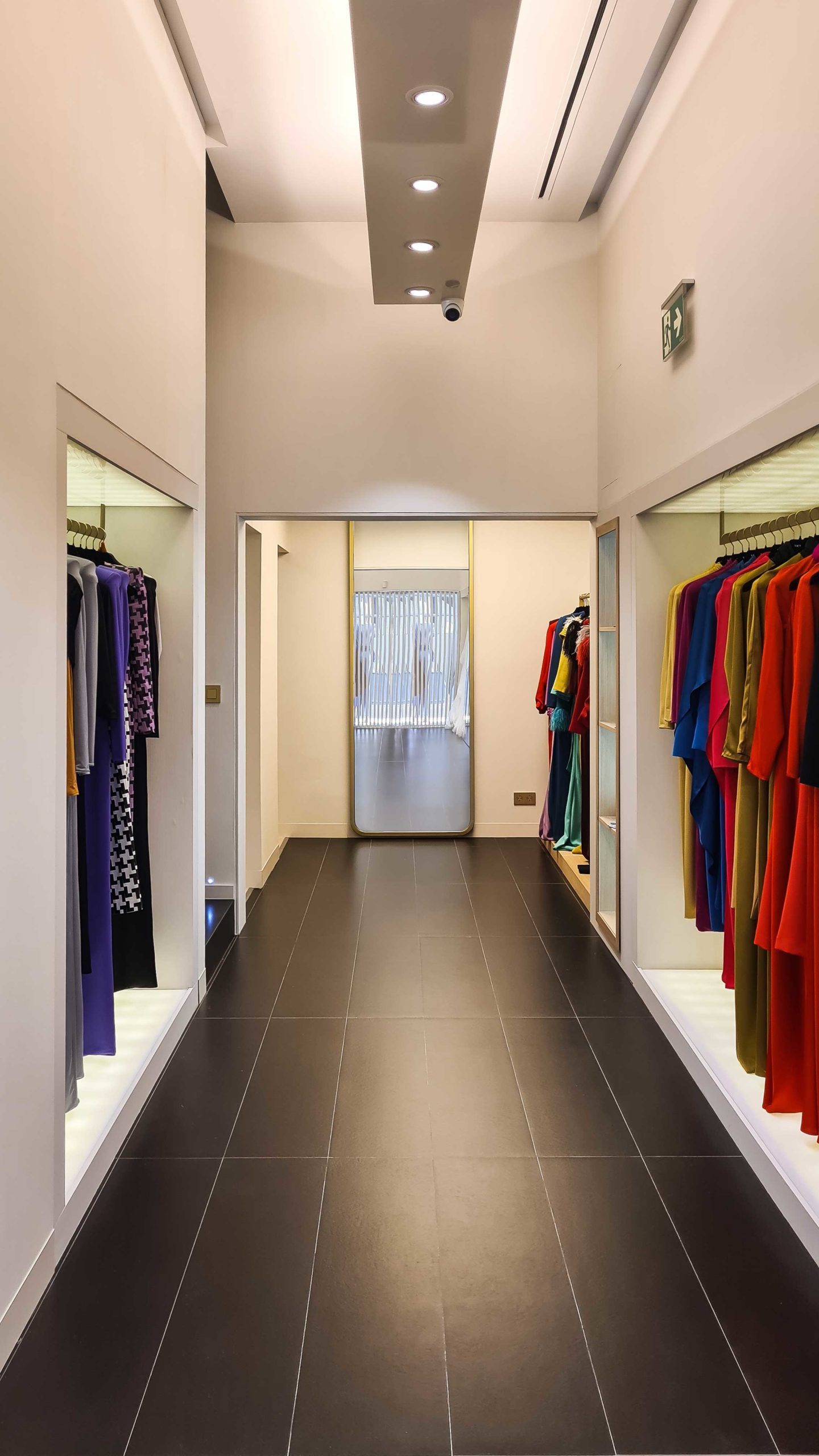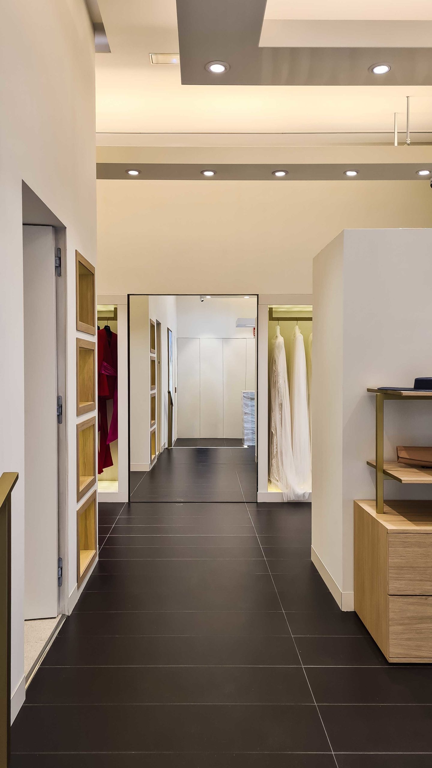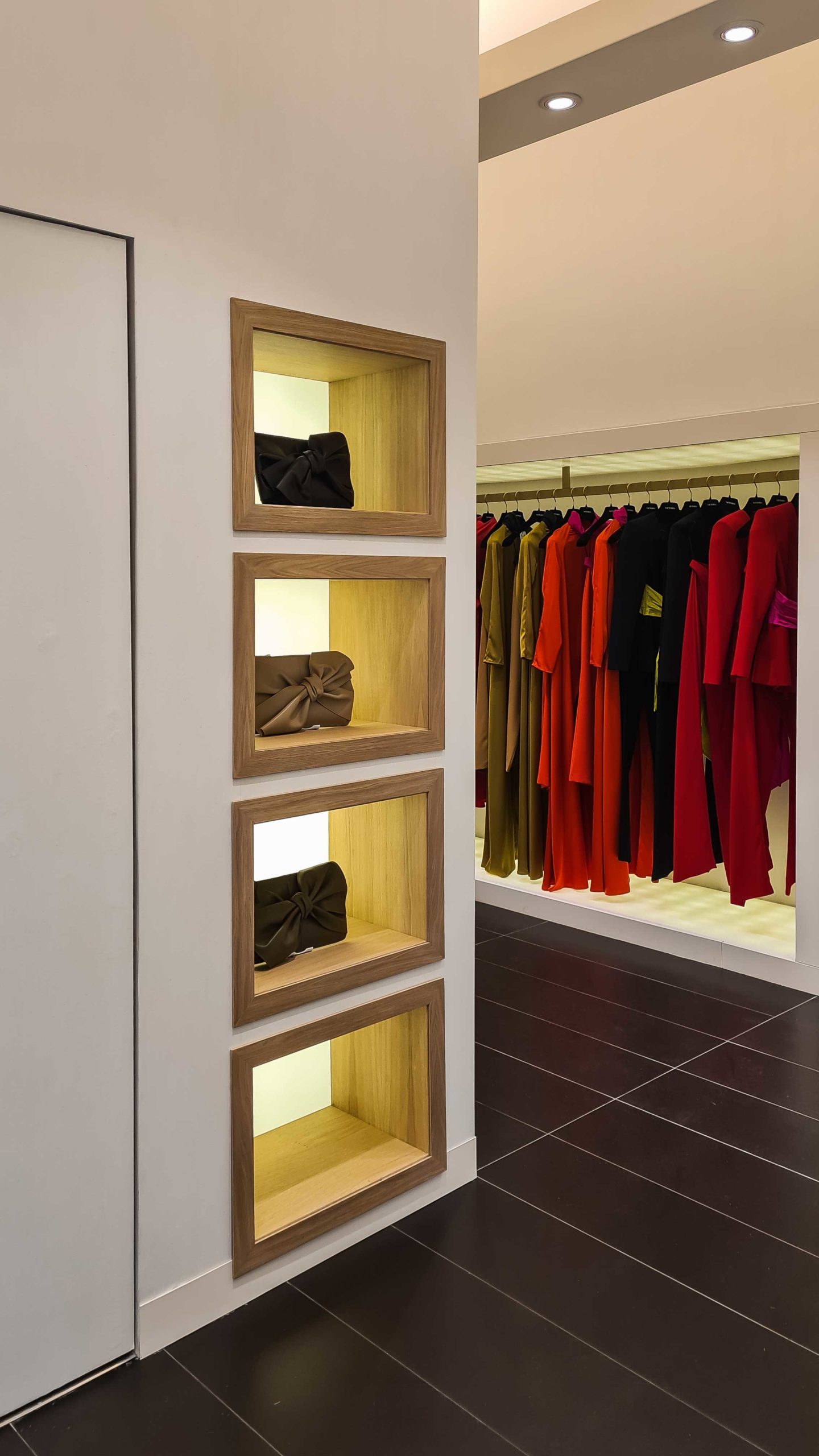 El espacio se desarrolla en diferentes zonas que permiten una exposición singular de ropa y accesorios dotándolos de un carácter premium, como si de una joyas se tratase.